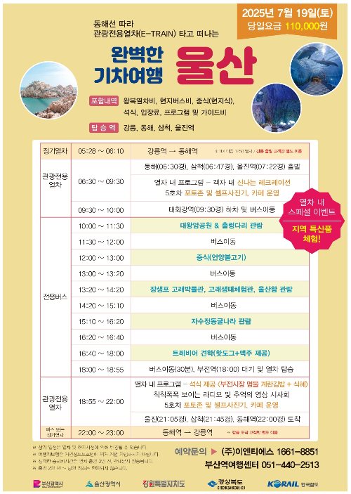 이처럼 '완벽한 기차여행'은 단순한 이동 수단을 넘어, 기차 안에서의 특별한 경험과 동해안의 숨겨진 보석 같은 명소들을 한 번에 만날 수 있는 올인클루시브 프로그램입니다. 시원한 바닷바람을 맞으며 기차 창밖으로 펼쳐지는 에메랄드빛 동해 바다를 감상하고, 각 지역의 문화와 미식을 체험하며 잊지 못할 여름 추억을 만들어 보세요. 올여름, 동해선 '완벽한 기차여행'과 함께 경북 동해안의 아름다움 속으로 떠나보시는 건 어떠신가요?