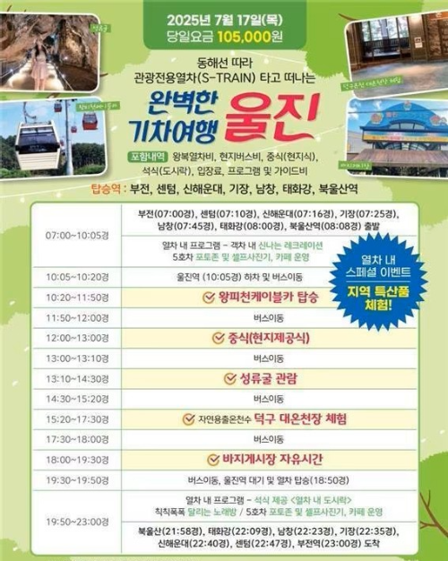 - 울진 노선: 울진 왕피천 케이블카, 성류굴, 덕구대온천장, 바지게시장을 방문하여 스릴 넘치는 경치, 지질학적 웅장함, 온천의 휴식, 그리고 지역 시장의 분위기를 만끽합니다.