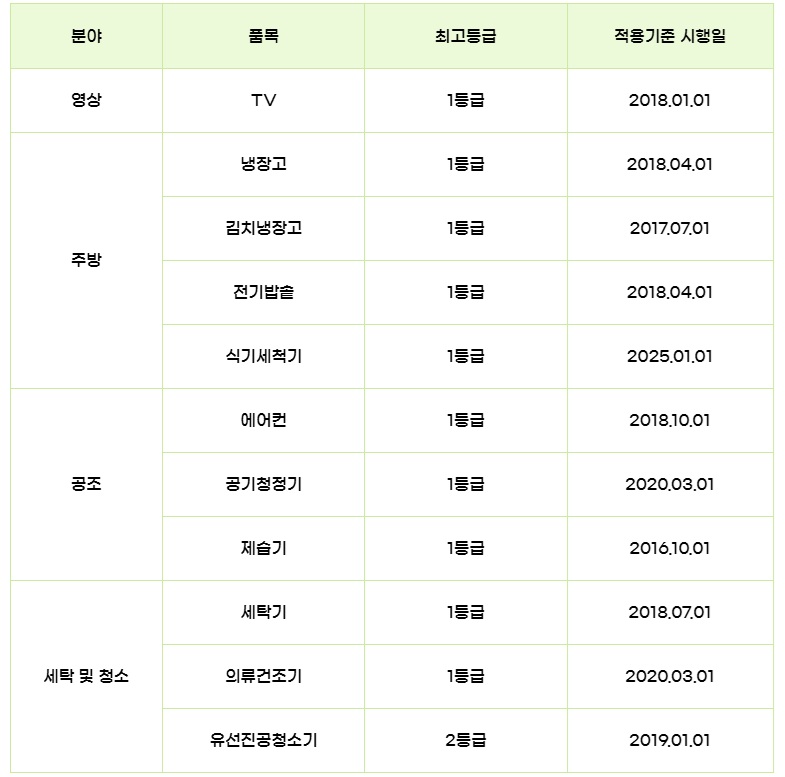 환급 대상 품목은 총 11가지로 한정되어 있으며, 해당 품목이 에너지소비효율 최고 등급을 충족해야 환급 신청이 가능합니다. 다음 표는 2025년 사업의 환급 대상 품목과 그에 해당하는 에너지 효율 등급 기준을 요약한 것입니다.